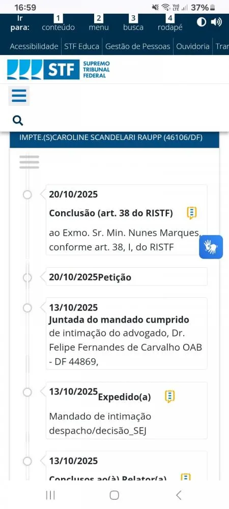 A movimentação mais recente, registrada nesta segunda-feira (20/10/2025), mostra a conclusão ao relator conforme o artigo 38, inciso I, do Regimento Interno do STF (RISTF), indicando que o caso foi oficialmente encaminhado ao ministro para análise e decisão.